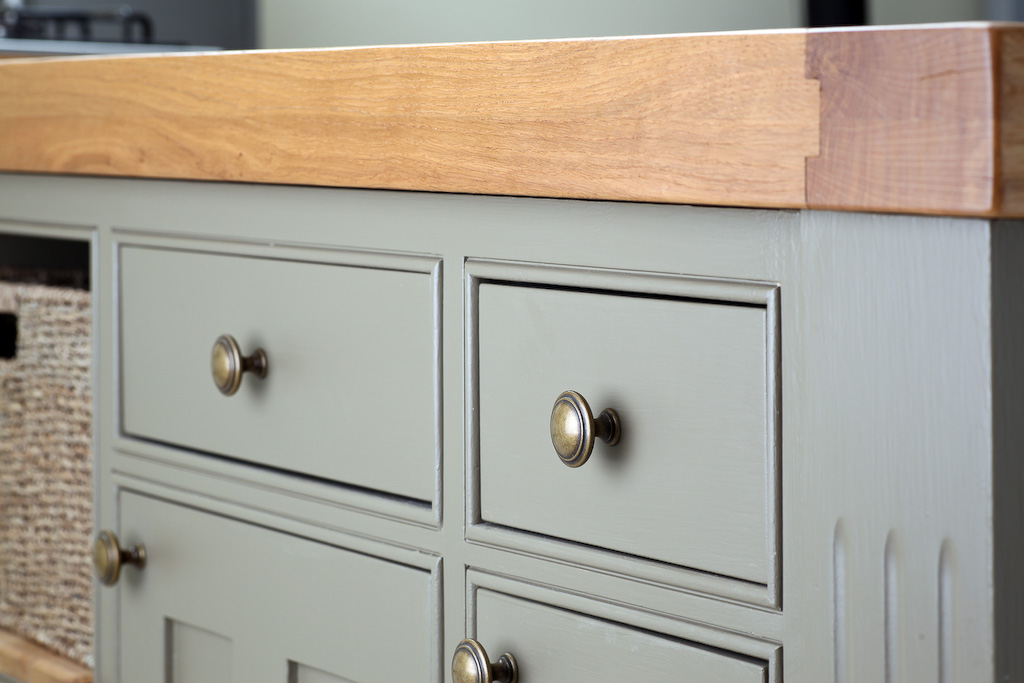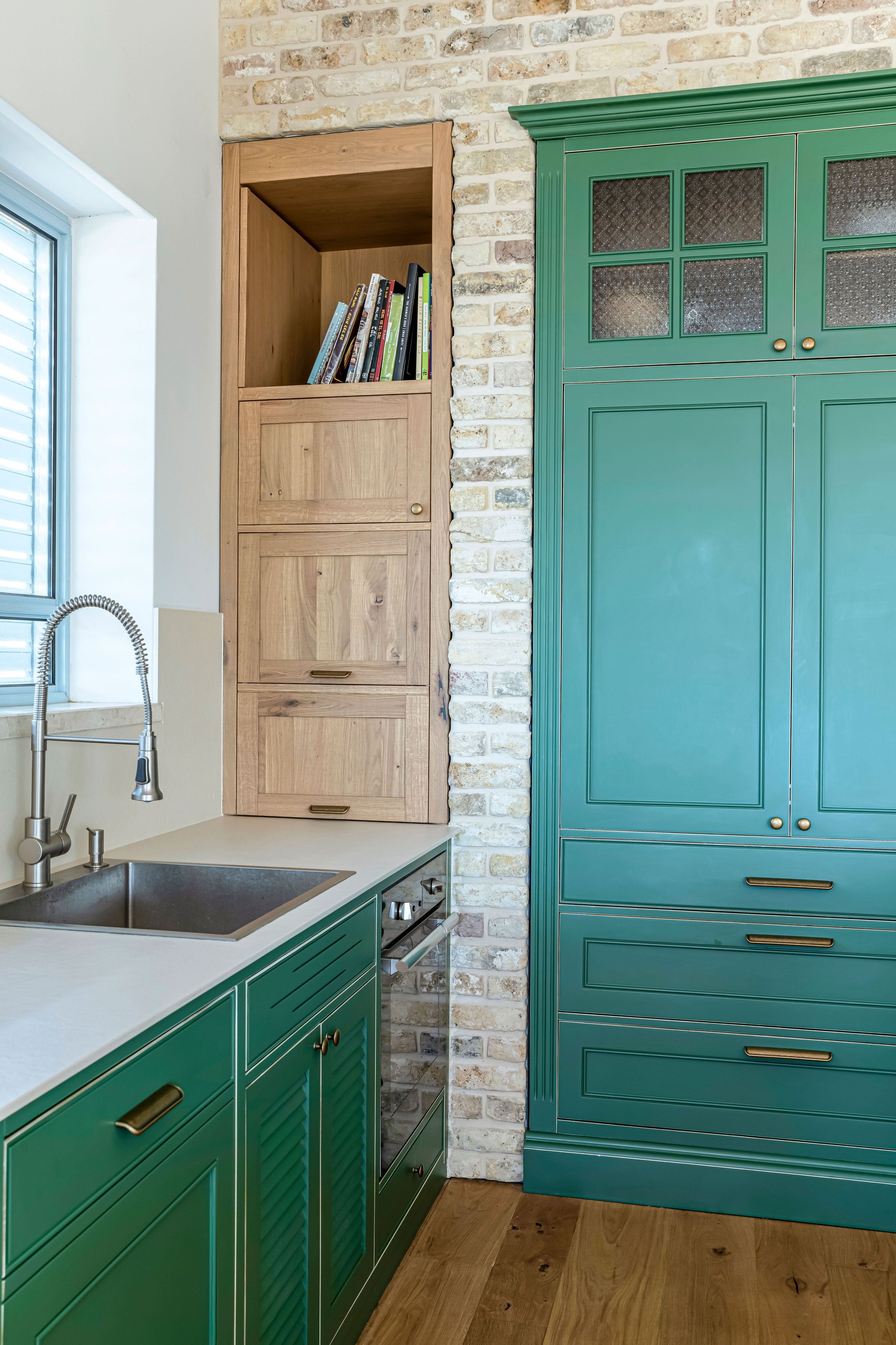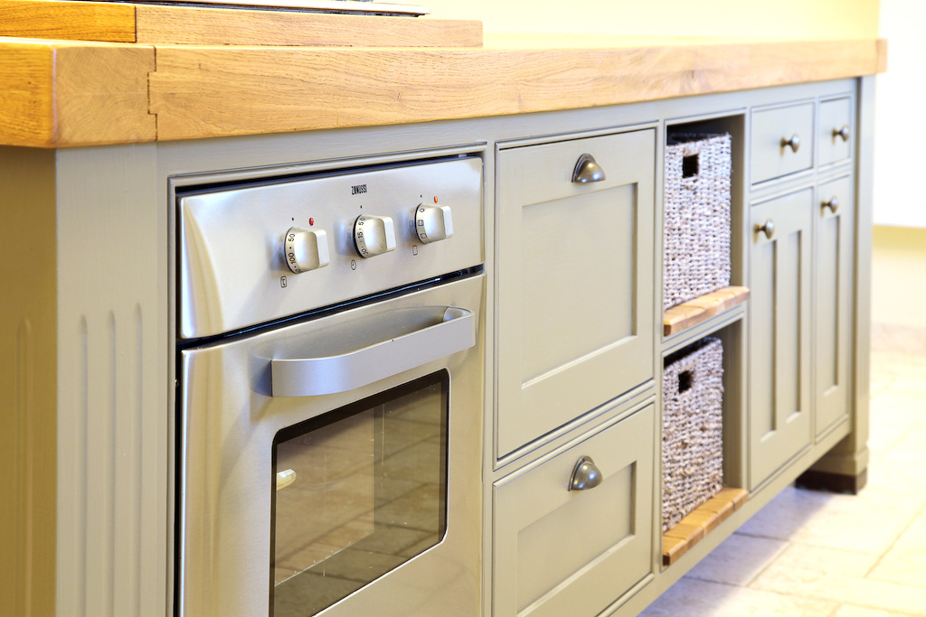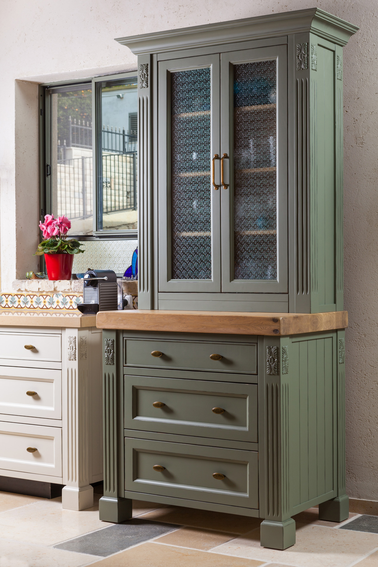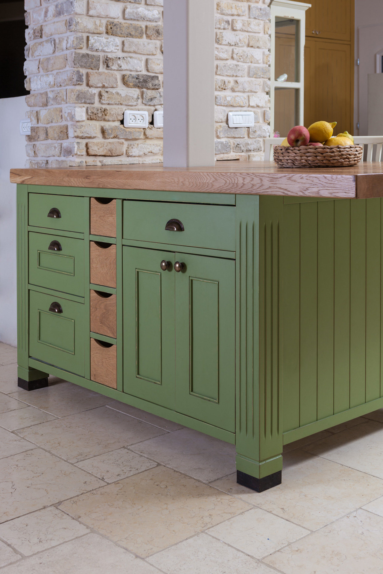 צבוע בצבע זית עומד במטבח.