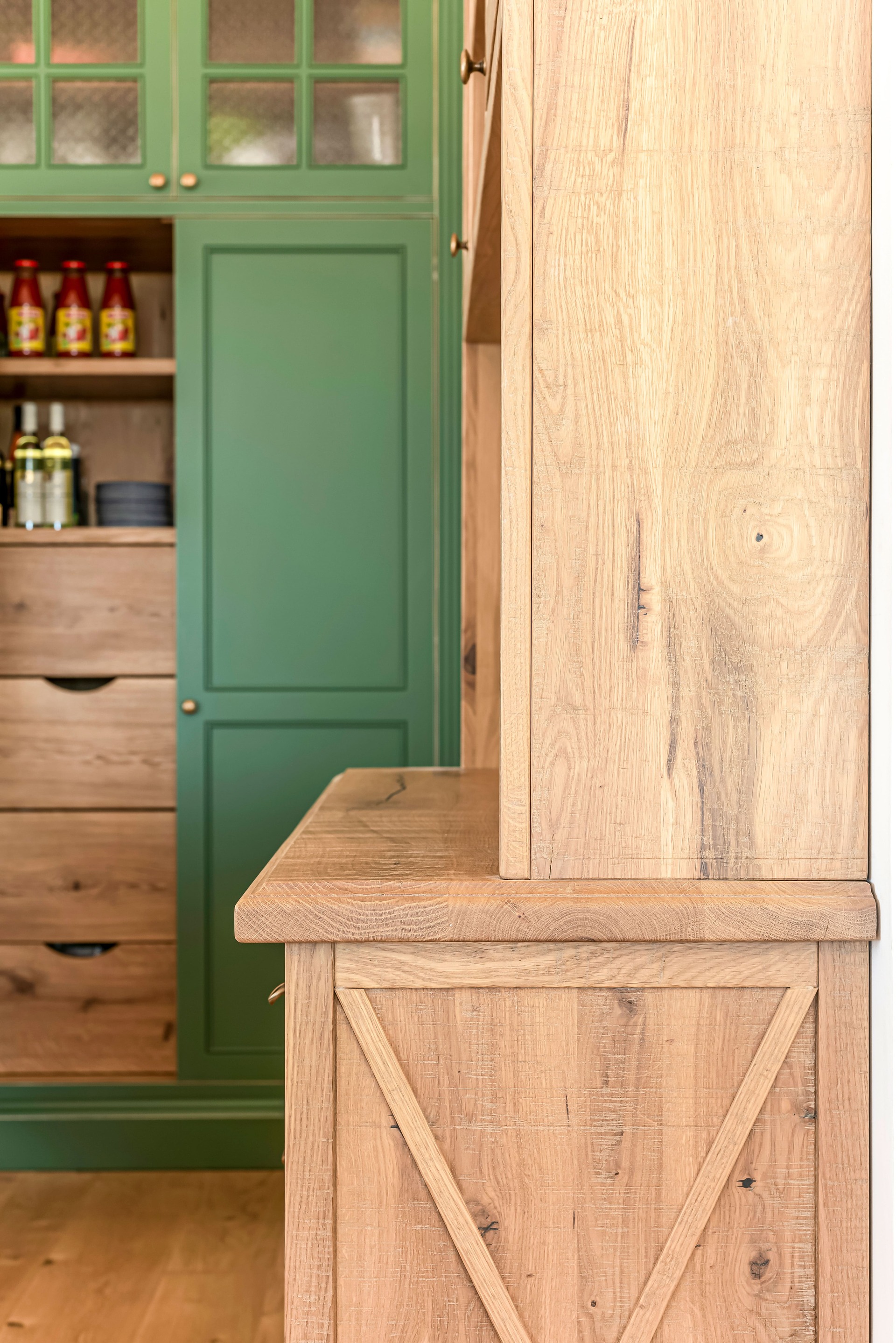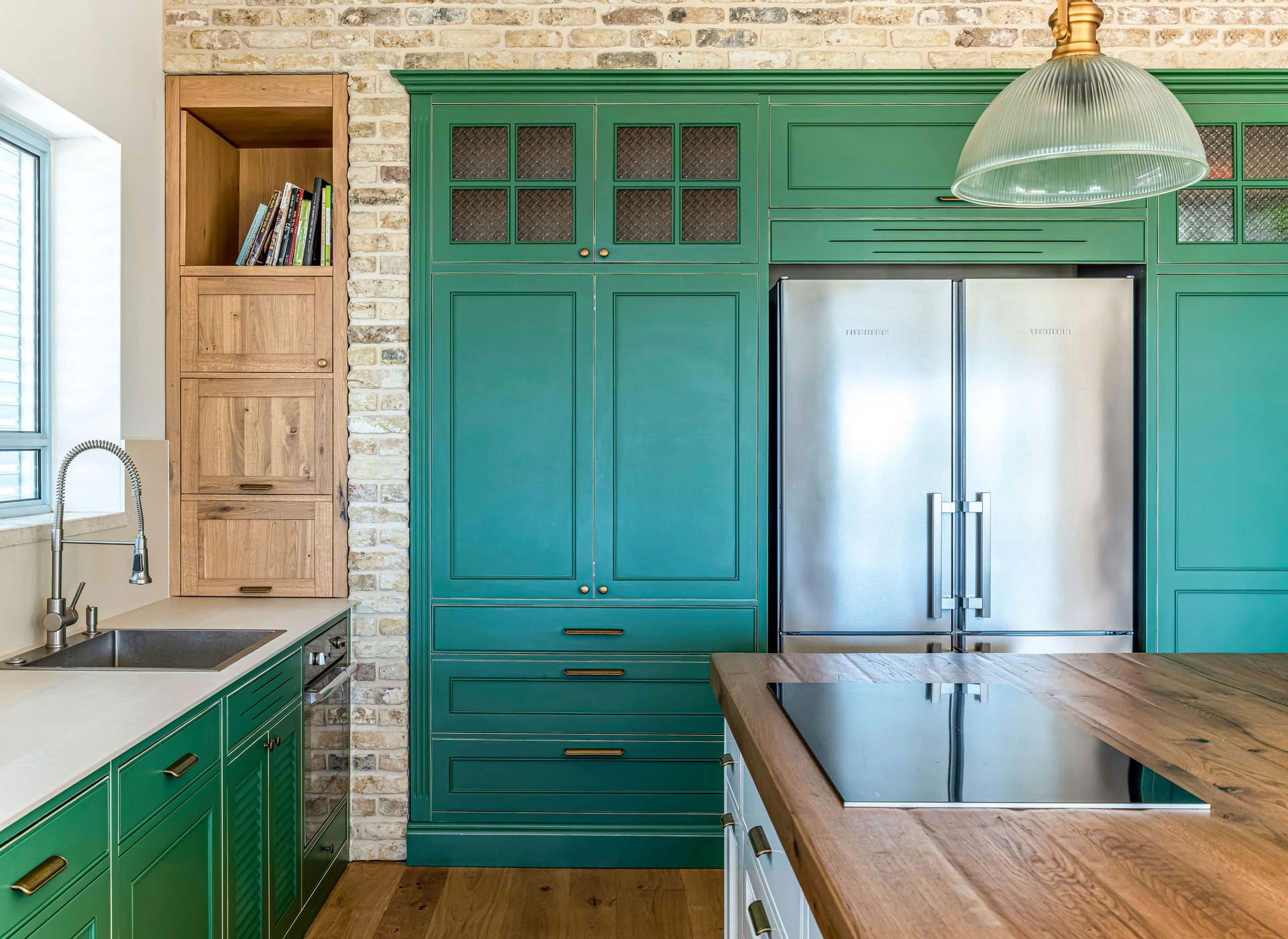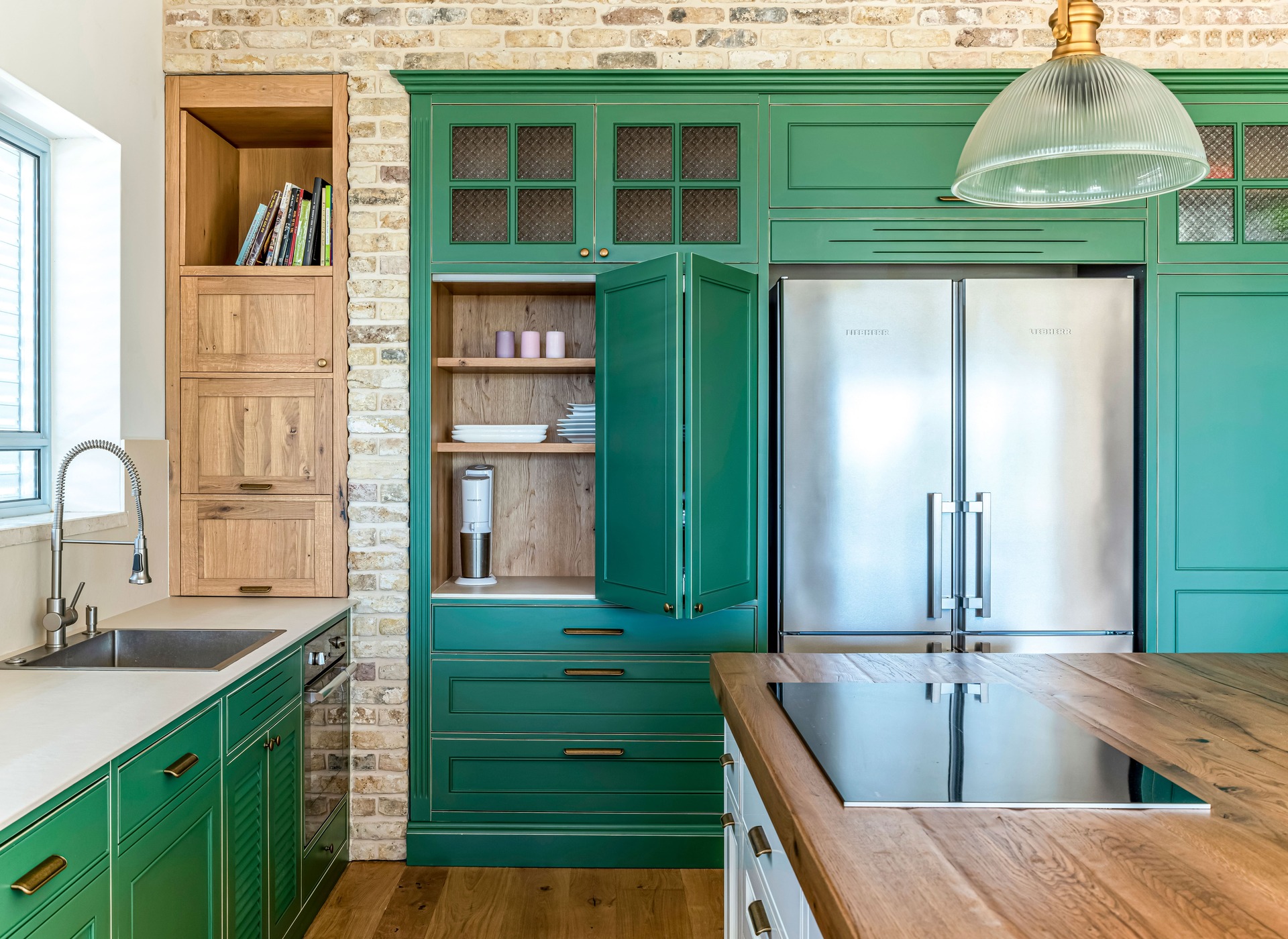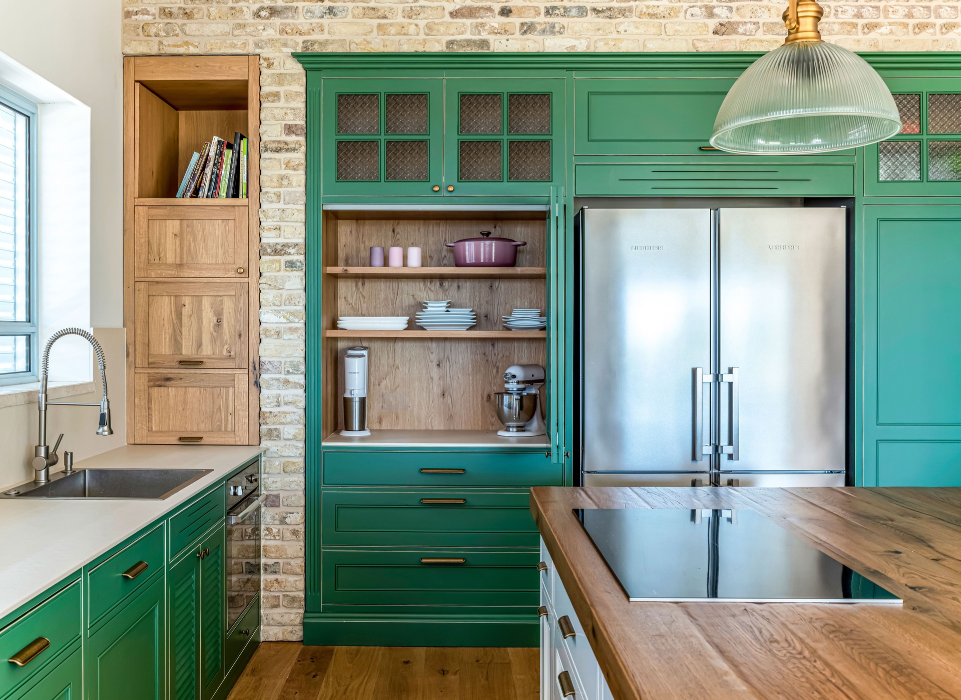 צבוע בצבע זית עומד במטבח.